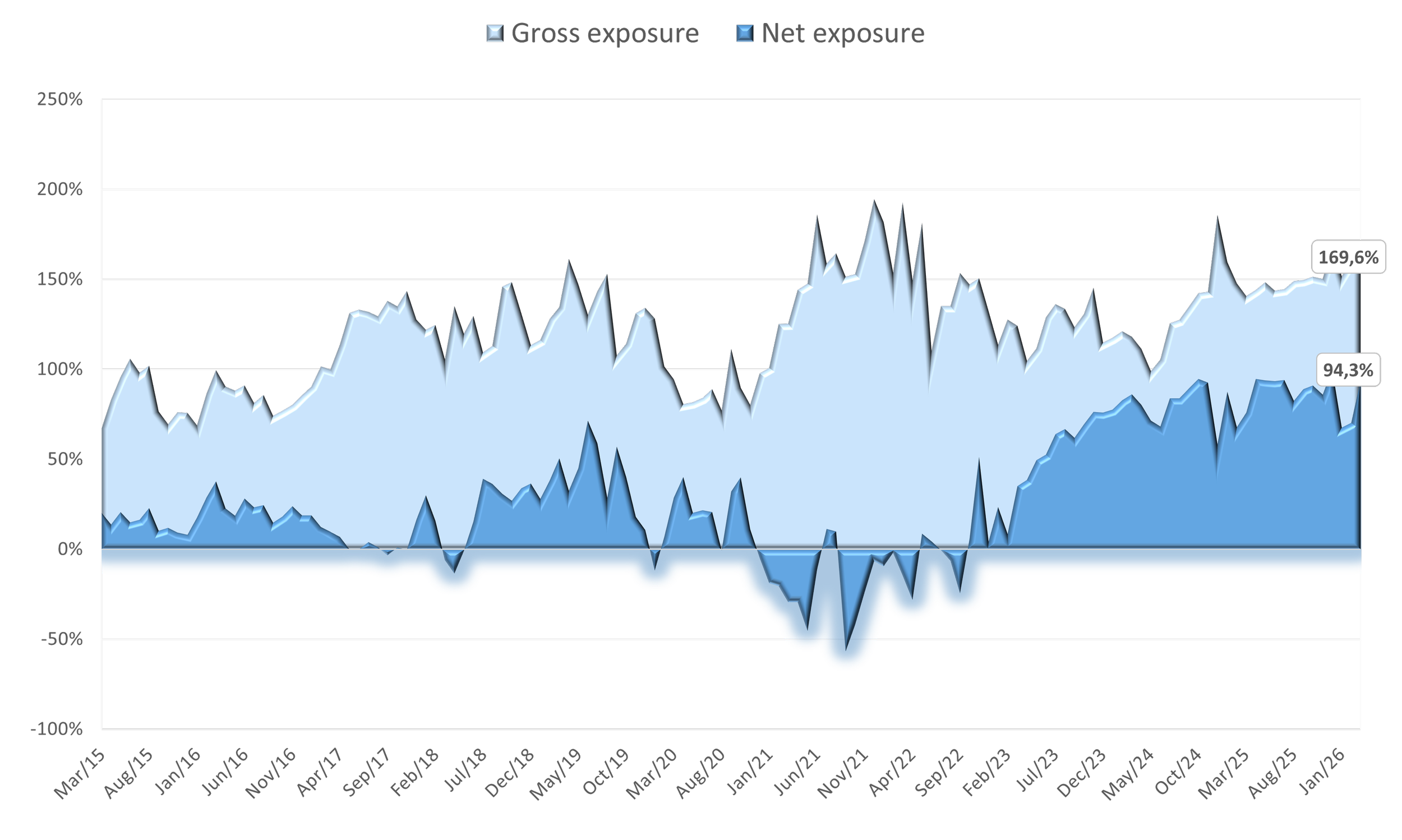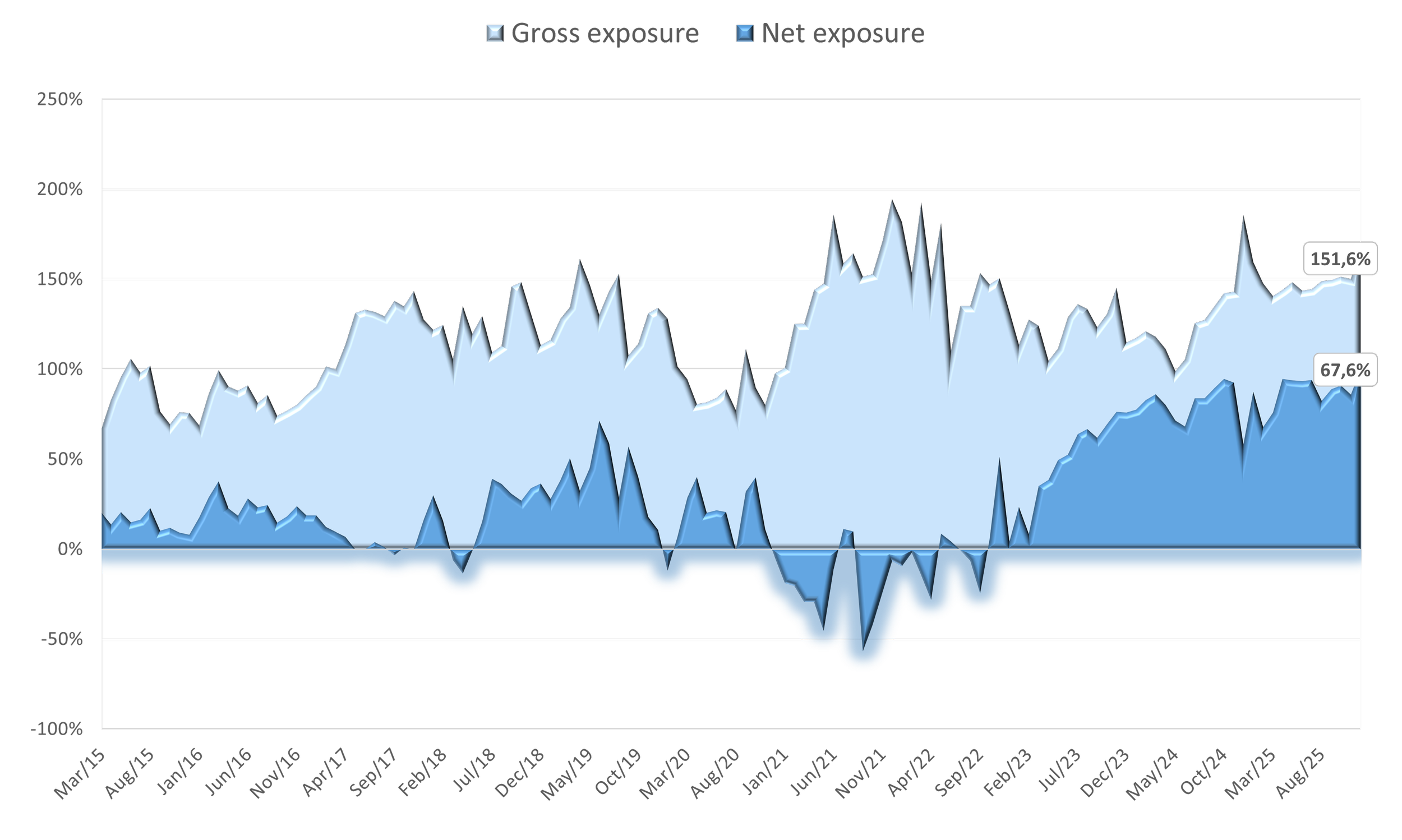 The Fund's gross and net exposure varies between years, months and even within months. The exposure in the graph above is only a snapshot and is calculated at the beginning of each month. It is not to be regarded as a relevant indicator of our general market view. In addition, the Fund may own financial instruments such as derivatives where, in such a case, the net exposure does not give a true and fair view of the underlying exposure given certain outcomes. We act on the basis of the opportunities that arise in the market, which means that both gross and net exposure will vary over time. Thus, there is no main purpose in always striving to be completely market neutral, instead the exposure is a result of the assessed potential vs. the risk in each individual investment.